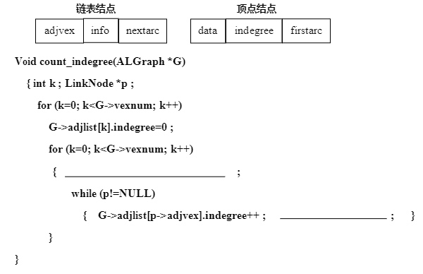 用正邻接链表保存有向图,各结点的结构形式如下,所有的顶点结点放在数组adjlist[]中,统计图中顶点的入度。