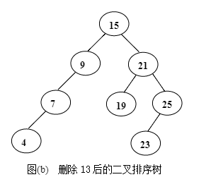 解:将关键字序列(15,21,13,7,4,9,25,19,23)生成二叉排序树T的过程如图(a)所示;删除13之后的二叉排序树T1如图(b)所示。