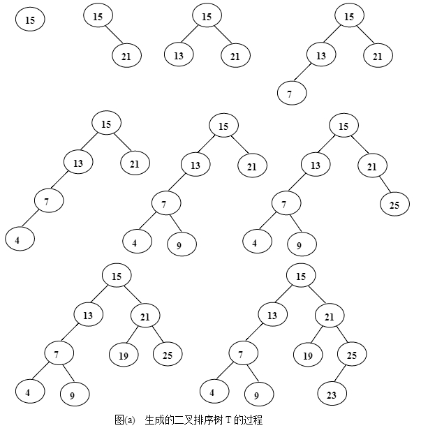 将关键字序列(15,21,13,7,4,9,25,19,23)插入到初态为空的二叉排序树中,请画出建立二叉排序树T的过程;然后画