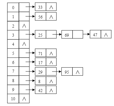 线性表的关键字集合{71,25,8,29,42,69,95,33,17,56,47},共有11个元素,已知散列函数为:H(k) = k MOD 11,采用链地址处理冲突,请给出对应的散列表结构,并计算该表成功查找的平均查找长度。