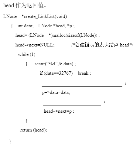【正确答案】:头插入法创建单链表,以整数的最大值(32767)作为输入结束,链表的头结点head作为返回值。