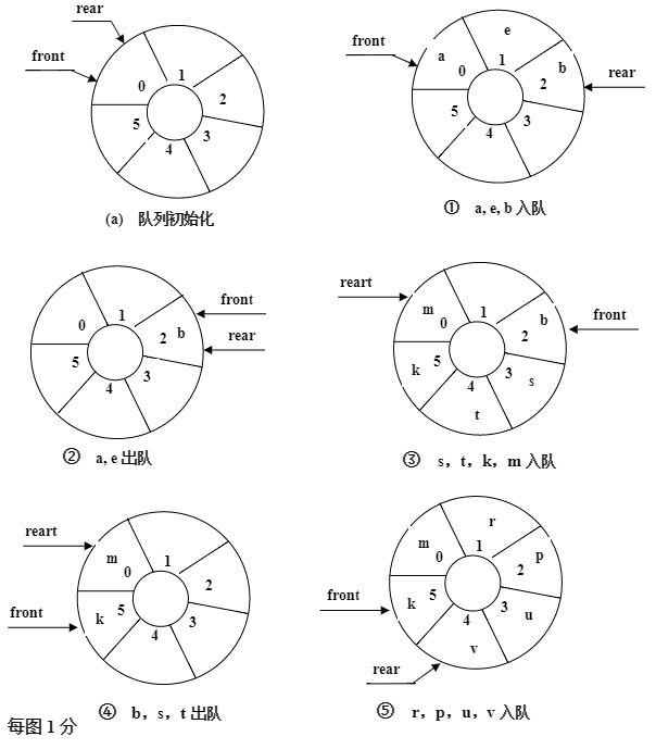 (1) a,e,b入队; (2) a,e出队; (3) s,t,k,m入队; (4) b,s,t出队; (5) r,p,u,v入队;