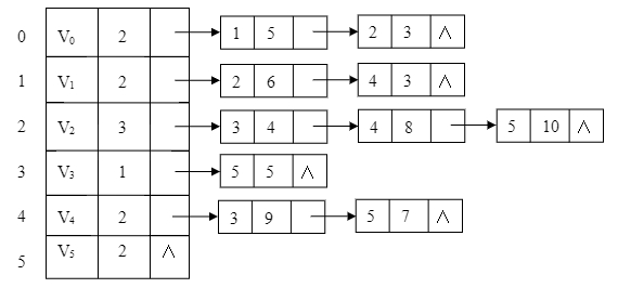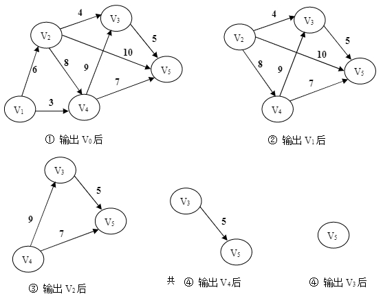 解:⑴ 该图的正邻接链表如下图所示:⑵ 给出对该图进行拓扑排序过程如下,其拓扑序列是:V0→V1→V2→V4→V3→V5