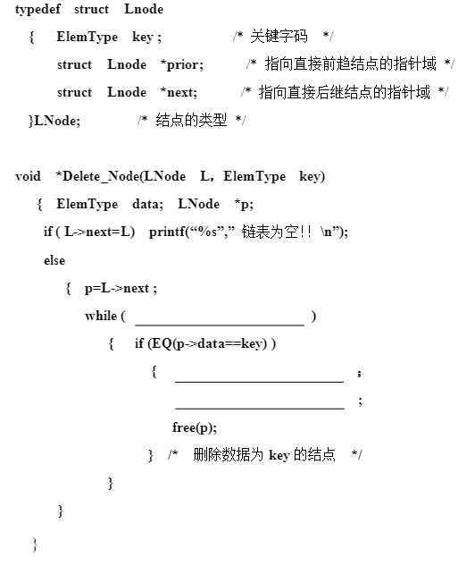 设有一个以L为头结点的双向循环链表,删除数据为key的所有结点,数据结构定义如下: