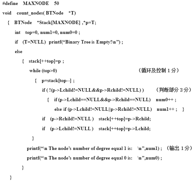 (1) 写出输出树中度为1及度为0的结点数的算法。(5分)
