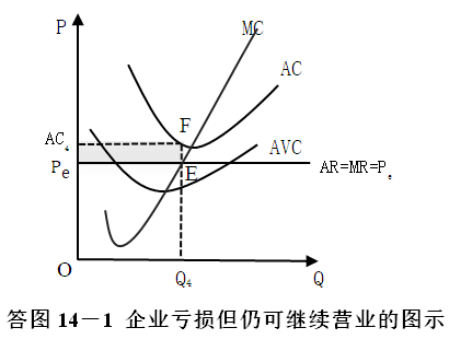 位于平均成本函数曲线的最低点的下方而又位于平均可变成本函数曲线的最低点的上方时,它与企业的边际成本函数曲线MC相交于E点,可以发现E点正好位于平均成本函数曲线最低点与平均可变成本函数曲线最低点之间。根据完全竞争市场企业实现利润最大化的决策原则MC=MR=