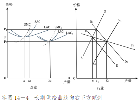 (4)如果要素成本会随着企业生产要素投入需求的增加而下降,那么企业的生产成本函数曲线会向下移动,这会形成比之前相对更低的市场均衡价格,长期供给曲线将会向右下方倾斜,如答图14-4所示。