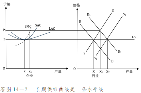 (2)当产品市场需求增加时,产品均衡价格在短期会上升,企业产量增加,行业均衡产量同时增加。由于相应产量的市场价格高于平均成本,完全竞争市场存在能够赚取大于零的经济利润机会。它会吸引更多新企业进入该行业,导致市场供给增加,市场均衡价格下降,均衡产量增加。由于行业供给增加需要更多的要素投入,如果生产要素成本能够一直维持不变的话,那么企业的成本函数跟原来保持一样,企业会采用边际成本等于市场价格的决策原则选择产量。完全竞争市场中企业不断进入或退出的结果,将会使得该行业的经济利润最终等于零。由于成本函数没变化,最终市场的产品均衡价格将会跟原来一样,此时长期供给曲线是一条水平线,如答图14-2所示。