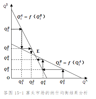,可以发现,此时企业A与企业B的最优产量反应确实存在明显的相互依存关系,博弈互动的过程会使得最优产量逐渐收敛于两条最优反应函数的交点E。