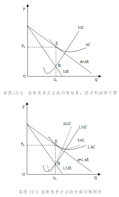 (1)垄断竞争市场没有进入和退出壁垒,企业可以自由进入和退出市场。因此,当垄断竞争企业的经济利润大于零时,它会吸引更多的企业进入该行业,行业供给增加,企业的产品需求因被市场更多的企业细分而减少,产品价格会下降。而当垄断竞争企业的经济利润小于零时,一部分企业会退出该行业,行业供给减少,企业的产品需求因更少企业划分市场而增加,产品价格会下降。因此,随着企业自由地进入和退出市场,市场供需不断调整,最终一定会出现经济利润等于零的情形,此时行业供求达到长期均衡的稳定状态。具体如答图15-2和答图15-3所示。