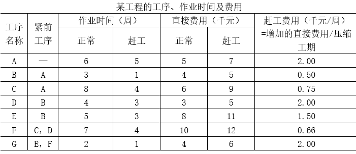 某工程由七道工序构成,有关资料如下表所示。该工程间接费用为每周1000元,在正常作业时间,人力、物力投入的直接费用为40000元
