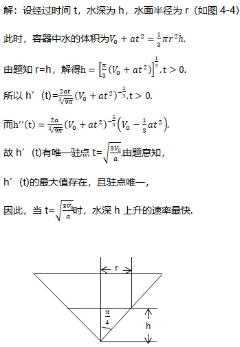 一顶角为π/2的圆锥形容器内盛有V0升水,现往里灌水, 从时刻t=0到时刻t时灌入的水量为at2(a>0)升,问何时水深h