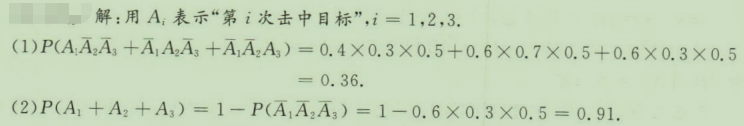 对同一目标进行三次独立射击,击中的概率分别为0.4,0.7和0.5。