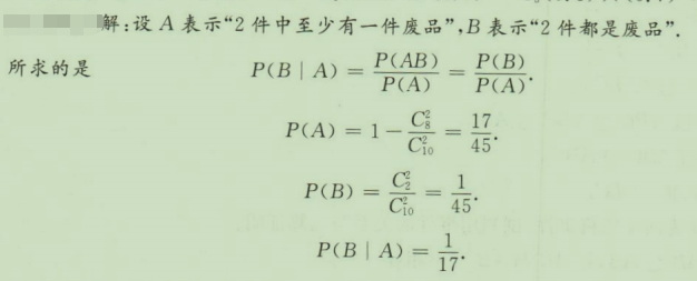 设10件产品中有2件废品,今从中任取2件,在已知其中一件是废品时,求另一件也是废品的概率。