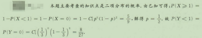 设随机变量X〜B(2,p),Y〜B(3,p),若P{X≥1}=5/9,则P{Y<1}=______。