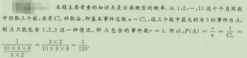 从1,2,・・・,10这十个自然数中任取三个数,则这三个数中最大的为3的概率是_______。