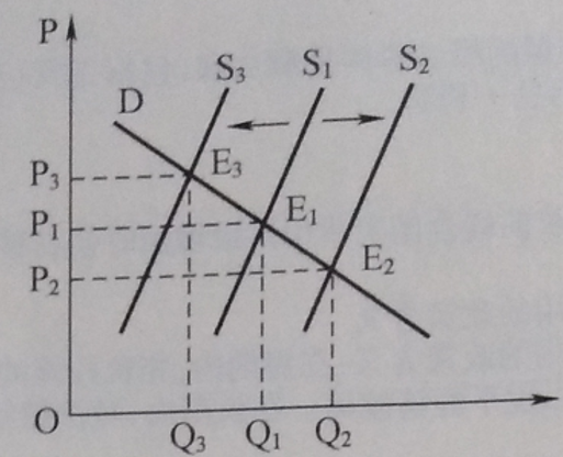 如图所示。一种商品的市场均衡也会因为市场供给的变动而被打破。在图中,最初市场在需求曲线D和市场供给曲线S的交点E1处达到均衡,所决定的均衡价格为P1,均衡数量为Q1,假定由于某种原因,比如生产的技术水平提高,使得市场供给增加,即市场供给曲线由S1向右下方移动到S2。那么,当新的市场需求D与新的市场供给S2相等时,市场再次处于均衡状态;如图中的E2点,新的均衡价格和均衡数量分别为P2和Q2。与原有的均衡相比,在需求保持不变的条件下,供给增加导致均衡价格下降均衡数量增加。