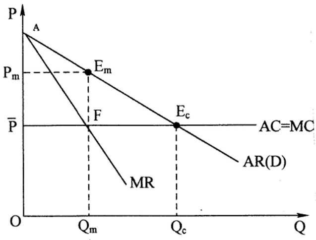 在完全竞争的市场条件下,厂商的产量为Qc,消费者的总效用为OAEcQc的面积,而厂商的生产成本为OPEcQc的面积,因此社会的净福利等于三角形PAEc的面积。在垄断市场条件下,厂商的产量为Qm,消费者由此获得的总效用为OAEmQm的面积,而厂商的生产成本为OPFQm的面积,从而社会净福利等于四边形PAEmF的面积。比较完全竞争市场和垄断市场两种情况不难发现,完全竞争市场条件下社会的净福利比垄断条件下要多,多出的部分恰好是三角形FEmEc的面积。因此,三角形FEm Ec。的面积度量了垄断造成的社会损失。