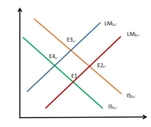 紧缩性财政政策和扩张性货币政策,IS曲线往左移动,LM曲线往右移动,利下降,产出方向不一定。