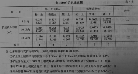(1)查《公路工程施工定额》第2章路基工程、第9节拖式铲运机铲运土方,定额见表4-3。2-9拖式铲运机铲运土方;