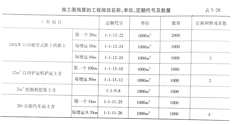 (3)本项目土方工程施工图预算的工程细目名称、单位、定额代号及数量,见表5-28。