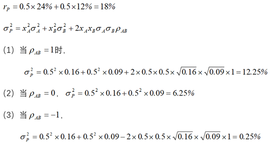 假设某投资者选择了A、B两个公司的股票构造其证券投资组合,两者各占投资总额的一半。已知A股票的期望收益率为24%,方差为16%,B股票的期望收益为12%,方差为9%。请计算当A、B两只股票的相关系数各为:(1)ρ