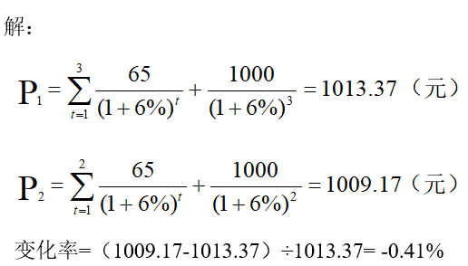 某债券的票面金额为1000元,票面利率为6.5%,期限3年,市场利率为6%,每年付息一次,试计算剩余期限从3年到2年债券价格的变化率。