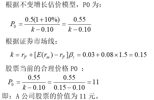 A公司去年每股股息为0.5元,预期今后每股股息将以每年10%的速度稳定增长。当前的无风险利率为0.03,市场组合的风险溢价为0.08,A公司股票的β值为1.5。那么,A公司股票当前的合理价格P