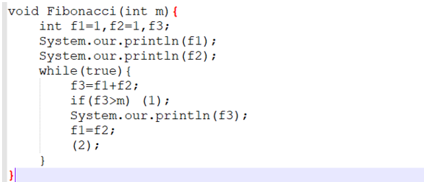 方法void Fibonacci(int m)的功能是输出不大于m的Fibonacci数列中的元素。注:Fibonacci数列的前两个数都是1,从第三个数开始,数列的每个数是其前面两个数之和。