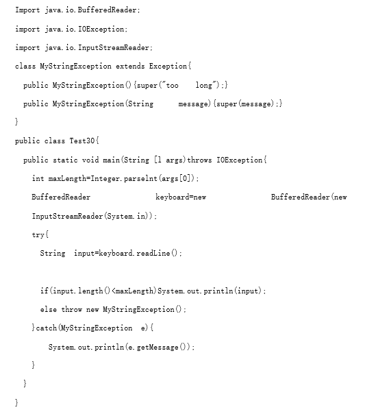 若字符串中所含字符个数少于程序设定的上限,则在屏幕上输出这个字符串;否则抛出 MyStringExeeption1 异常,在异常处理中输出“too long”( 1 分 )