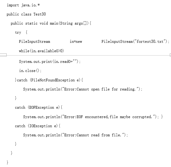 【正确答案】:该程序读入文件“fortest30.txt”,将文件内各字符的ASCⅡ码输出到屏幕上,如果打开文件时出错,则进行异常处理,显示对应的出错信息.
