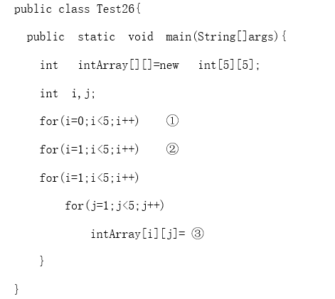以下程序的运行结果是将如下的矩阵保存在5行5 列的二维数组 intArray 中,除第一行和第一列外,每个位置的元素是其左侧相邻