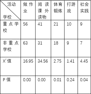 问题:两类学校学生在课余时间哪些活动表现为差异不显著?哪些活动表现为差异显著? 哪些活动表现为差异极显著?