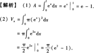 【题目解析】:(1)所求平面图形的面积为: $A=\int_{0}^{1}e^{x}dx=e^{x}\vert_{0}^{1}=e-1$。 (2)该平面图形绕$x$轴旋转一周所得旋转体的体积为: $V_{x}=\pi\int_{0}^{1}(e^{x})^{2}dx=\pi\int_{0}^{1}e^{2x}dx=\frac{\pi}{2}e^{2x}\vert_{0}^{1}=\frac{\pi}{2}(e^{2}-1)$。