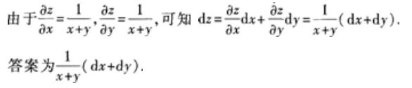 【题目解析】:首先,根据链式法则,对函数$z=\ln(x+y)$关于$x$求偏导数,得到: $\frac{\partial z}{\partial x}=\frac{1}{x+y}$ 然后,对函数$z=\ln(x+y)$关于$y$求偏导数,得到: $\frac{\partial z}{\partial y}=\frac{1}{x+y}$ 最后,根据全微分的定义,$dz=\frac{\partial z}{\partial x}dx+\frac{\partial z}{\partial y}dy$,将上面求得的偏导数代入,得到: $dz=\frac{1}{x+y}dx+\frac{1}{x+y}dy=\frac{1}{x+y}(dx+dy)$ 因此,全微分$dz=\frac{1}{x+y}(dx+dy)$。