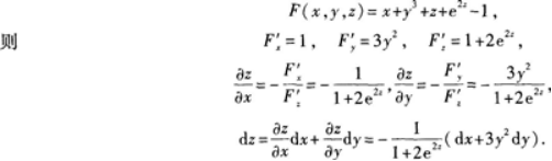 【题目解析】:首先,令$F(x,y,z)=x+y^3+z+e^z-1$,则$F_x=1$,$F_y=3y^2$,$F_z=1+e^z$。 然后,根据隐函数求偏导数公式,有: $\frac{\partial z}{\partial x}=-\frac{F_x}{F_z}=-\frac{1}{1+e^z}$ $\frac{\partial z}{\partial y}=-\frac{F_y}{F_z}=-\frac{3y^2}{1+e^z}$ 最后,将$\frac{\partial z}{\partial x}$和$\frac{\partial z}{\partial y}$代入$dz=\frac{\partial z}{\partial x}dx+\frac{\partial z}{\partial y}dy$,得到: $dz=-\frac{1}{1+e^z}dx-\frac{3y^2}{1+e^z}dy$
