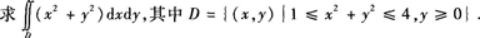 积分区域D为半圆环域,利用极坐标计算此二重积分较方便.在极坐标系下,戈2+Y2=1可以化为r=1;x2+y2=4可以化为r=2.因此区域D可以表示为