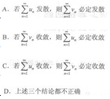 【题目解析】:un、vn可能为任意数值,因此正项级数的比较判别法不能成立,可知应选D.