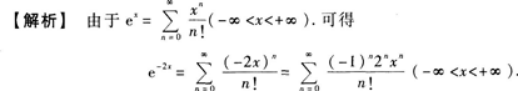 【题目解析】:根据已知的泰勒展开式 \(e^x=\sum_{n=0}^{\infty}\frac{x^n}{n!}=1+x+\frac{x^2}{2!}+\frac{x^3}{3!}+...\) 可得: \(e^{-2x}=\sum_{n=0}^{\infty}\frac{(-2x)^n}{n!}=\sum_{n=0}^{\infty}\frac{(-2)^nx^n}{n!}=1-2x+\frac{(-2)^2x^2}{2!}+\frac{(-2)^3x^3}{3!}+...\) 因此,函数\(f(x)=e^{-2x}\)展开为 x 的幂级数为\(\sum_{n=0}^{\infty}\frac{(-2)^nx^n}{n!}\)。由于幂级数在其收敛域内是绝对收敛的,而\(\sum_{n=0}^{\infty}\frac{(-2)^nx^n}{n!}\)的收敛半径是\(\infty\),所以该幂级数的收敛域是\((-\infty,\infty)\)。