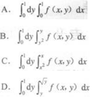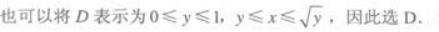 积分区域D可以由0≤x≤1,x2≤y≤x表示,其图形为右图中阴影部分.