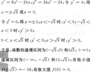 确定函数y=2x4-12x2的单调区间、极值及函数曲线的凸凹性区间和拐点.