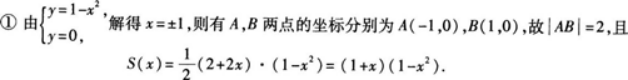 设抛物线y=1-x2与x轴的交点为A,B,在它们所围成的平面区域内,以线段AB为下底作内接等腰梯形ABCD(如图1—2-2所示).设梯形上底CD长为2x,面积为S(x).