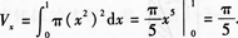 【题目解析】:曲边梯形绕\(x\)轴旋转一周所得旋转体体积为: \[ \begin{align*}V&=\pi\int_0^1y^2dx\\&=\pi\int_0^1x^2\times(x^2)dx\\&=\pi\int_0^1x^4dx\\&=\pi\times\frac{1}{5}x^5\vert_0^1\\&=\pi\times(\frac{1}{5}\times1^5-\frac{1}{5}\times0^5)\\&=\frac{\pi}{5}\end{align*} \] 所以正确答案为\(\frac{\pi}{5}\)。