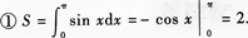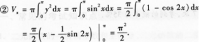 【题目解析】:对于①,曲线$y=\sin x$在区间$(0,\pi)$上与$x$轴围成的图形面积,根据定积分的几何意义,等于$\int_{0}^{\pi}\sin xdx$,计算可得$-\cos x\vert_{0}^{\pi}=(-\cos\pi)-(-\cos0)=2$,所以面积$S=2$。 对于②,该平面图形绕$x$轴旋转一周所得旋转体的体积,利用旋转体体积公式$V=\pi\int_{a}^{b}[f(x)]^{2}dx$,可得$V_x=\pi\int_{0}^{\pi}\sin^{2}xdx$,将$\sin^{2}x=\frac{1-\cos2x}{2}$代入计算可得具体结果。