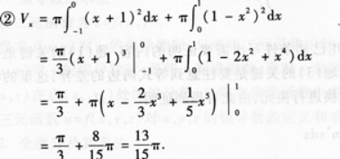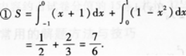 【题目解析】:下面为你分析题目: 首先来分析题目①,要求平面图形的面积,第一步需要找到曲线和直线的交点,对于给定的曲线$y=1-x^2$和直线$y=x+1$,令两个方程相等: \(1-x^2=x+1\) ```compute Solve[1-x^2 == x+1, x, Reals] 我们有方程 1-x^2 = x+1 将方程两边同时减去 1 1-1-x^2 = x+1-1 0-x^2 = x -x^2 = x 将方程两边同时乘以-1 x^2 = -x 将方程两边同时加上 x x^2+x = 0 我们使用二次函数的求根公式 [-b ± √(b^2-4ac)]/(2a), 代入 a = 1, b = 1, c = 0 x = [-1 ± Sqrt(1^2-4*1*0)]/(2*1) x = [-1 ± Sqrt(1-4*0)]/2 x = [-1 ± Sqrt(1-0)]/2 x = [-1 ± Sqrt(1)]/2 x = (-1 ± 1)/2 x = (-1+1)/2 || x = (-1-1)/2 x = 0/2 || x = -2/2 $x = 0 || x = -1$ 最终答案:{{x -> -1}, {x -> 0}} ``` \(x=-1 或 x=0\) 第二步,根据交点和曲线、直线与\(x\)轴的交点确定积分限,这里我们以\(x\)轴为横轴建立坐标系,积分下限为交点中的较小值,积分上限为交点中的较大值;第三步,根据公式\(S=\int_{a}^{b}f(x)dx\)(\(S\)表示面积,\(f(x)\)为曲线方程)计算得到平面图形面积。 接下来对题目②进行分析,求平面图形\(D\)绕\(x\)轴旋转一周所形成的旋转体的体积,根据 RotatingDiskMethod 公式可以得到:\(V=\pi\int_{a}^{b}f(x)^2dx\)(\(V\)表示体积),由①可得\(a=-1\),\(b=0\),\(f(x)=x+1\),代入公式就能求出答案。 因此,答案为①\(\frac{2}{3}\);②\(\frac{\pi}{6}\)。