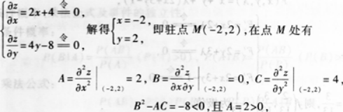 【题目解析】:本题主要考察多元函数的极值求解。首先,需要对函数z求偏导,得到两个偏导数方程。然后,解这两个方程得到驻点。接着,利用二阶导数判断驻点是否为极值点,并确定极值的类型(极大值或极小值)。最后,将极值点的坐标代入原函数,求得极值。