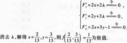 【题目解析】:这是利用拉格朗日乘数法求条件极值的问题。通过构造拉格朗日函数 F(x,y,λ)=x²+y²+λ(2x+3y-1),然后分别对 x、y、λ求偏导,并令偏导数等于 0,可得到一组方程组,从而求出可能的极值点。再进一步判断这些点处是极大值还是极小值。具体的计算和推理过程在给出的图片中有详细展示。