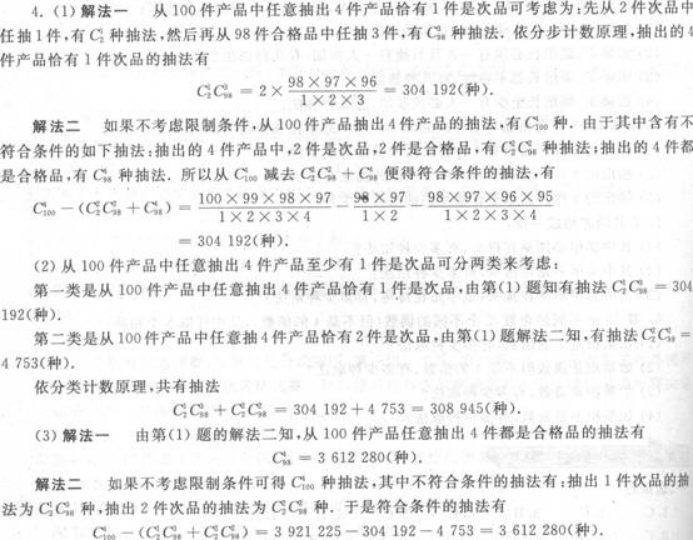 从含有98件合格品与2件次品的100件产品中任意抽出4件: (1)抽出的4件产品恰有1件是次品的抽法有多少种 (2)抽出的4