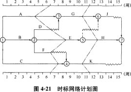 某工程双代号时标网络计划执行到第6周末和第11周末时,检查其实际进度如图4-21前锋线所示,检查结果表明( )。