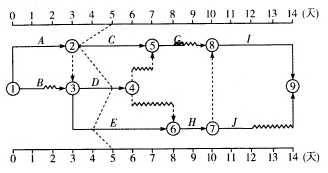 某分部工程时标网络计划如图所示。当该计划执行到第5天结束时检查实际进展情况,实际进度前锋线表明( )。